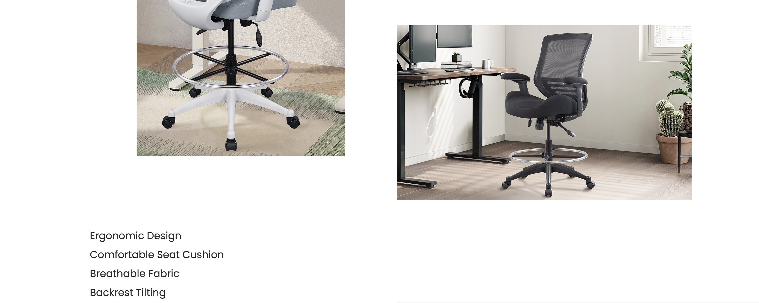 - Foot Ring: When you seat on the chair, you can put the feet on the foot ring to put less pressure on your legs. When you long time sit on the chair to work, you will feel comfortable.