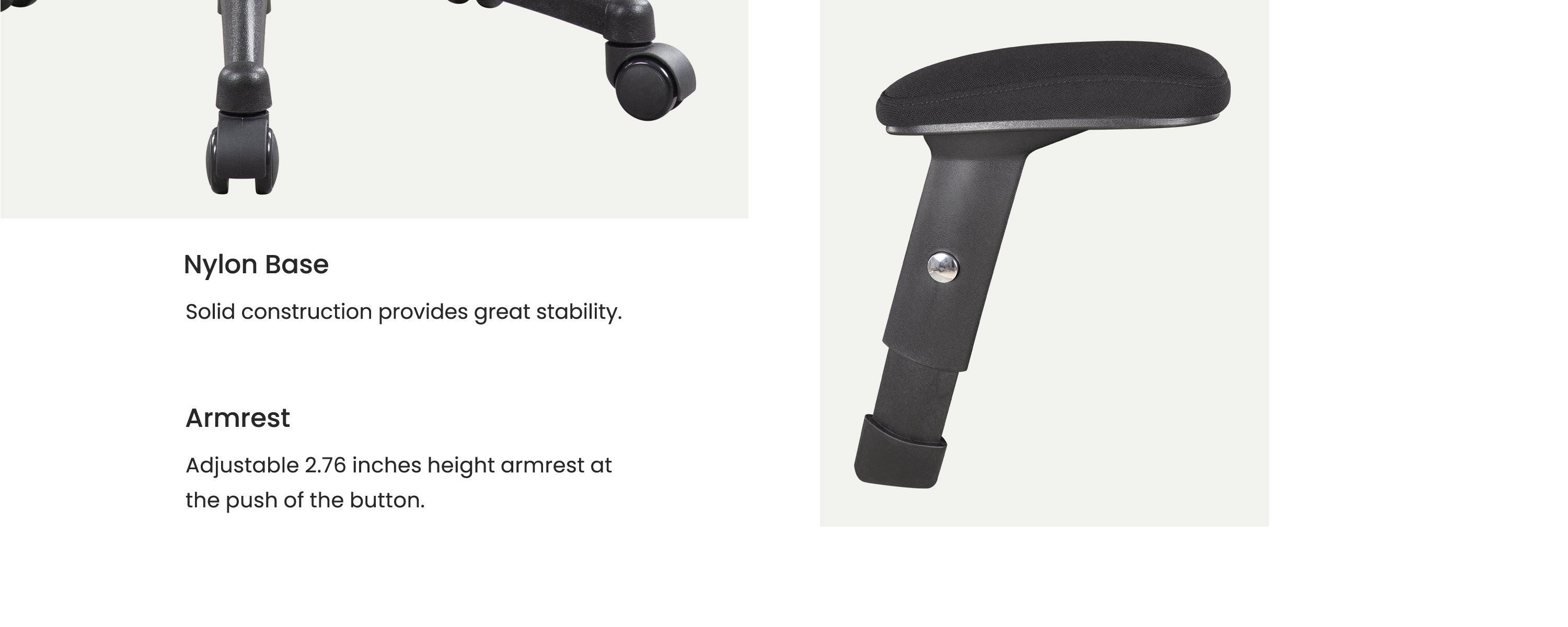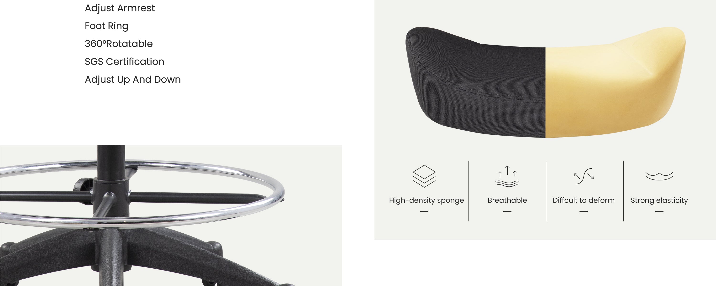 - Seat: Use 4inches thick molded foam with special shape cushion, long time seat will not deform. At the same time, it improve the comfort. The height of seat is adjusted to fit with different job and life needs. The lengthened cylinder is the good partner with high-standing desks.